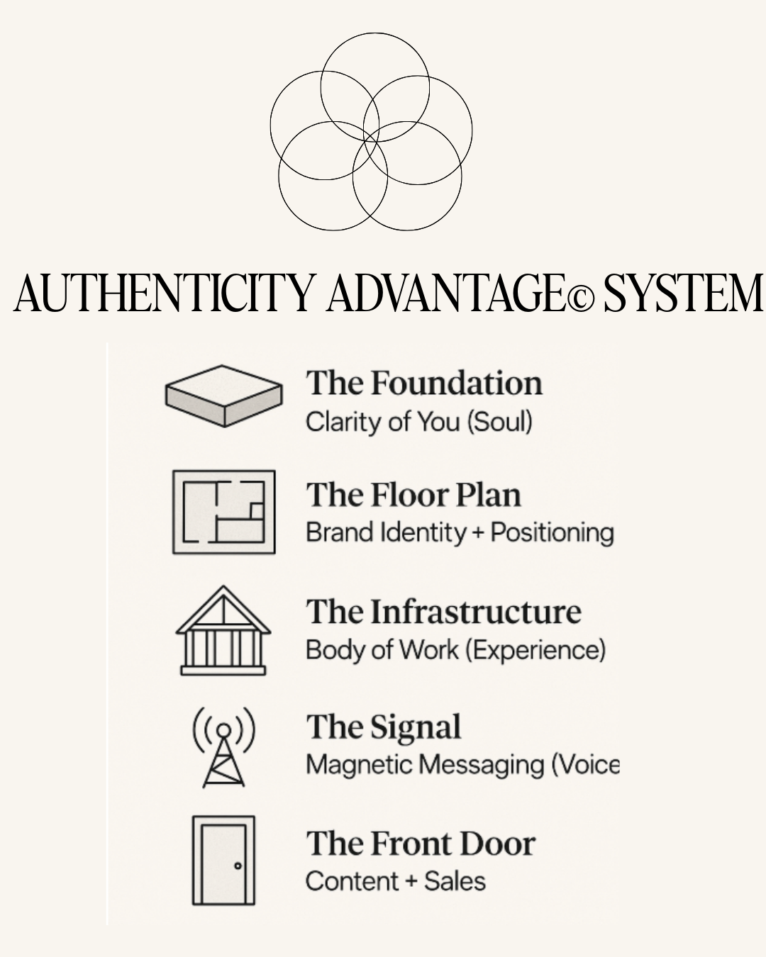 The 5-part strategic + energetic system every conscious, creative entrepreneur needs to build their brand and business that feels like home and lasts the long haul. This is where business strategy, body of work infrastructure, and marketing strategy meet energetics. You can't have one without the other--this system is completely comprehensive--not over-focused on one over the other